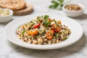 It’s the easy weeknight dinner that tastes fancy. Salmon brings omega-3s that help reduce inflammation (hello, less water retention), while lemon and garlic brighten everything up. Quinoa boosts fiber and protein, so you stay full without even trying.